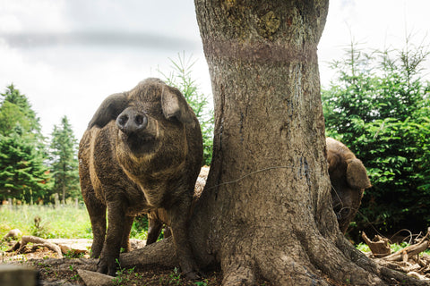 Nos porcs forestiers sont élevés en liberté, de la naissance à l’abattage, dans un grand enclos spécialement conçu pour eux. Ils ont accès à un pacage, un boisé et un abri. En plus de fouiner pour manger racines et plantes, ils sont nourris de fruits et légumes, de fourrages et de grain.